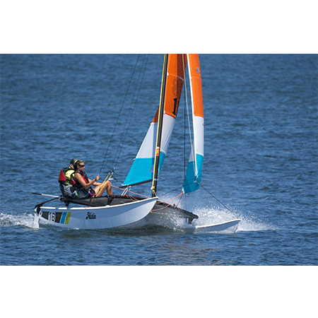 – Vele a taglio orizzontale in dacron colorato, randa senza boma, terzarolabile