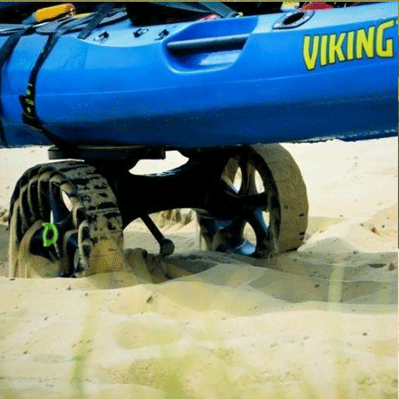 Quando si tratta di spostare carichi su sabbia soffice, le ruote più larghe non sono necessariamente migliori. I bulldozer e i carri armati militari utilizzano tracce lunghe, riducendo la possibilità che possano scavare. SandTrakz fora le ruote libere per simulare questo sistema di binari, mentre il cerchio esterno si comprime quando è in uso, dando una maggiore lunghezza del binario. Sulla sabbia soffice, questo riduce la fatica che devi tirare per spostare il tuo carrello di oltre la metà rispetto alle normali ruote Kiwi * senza forare!