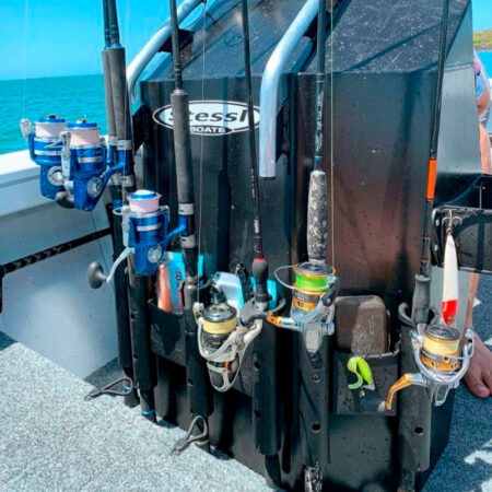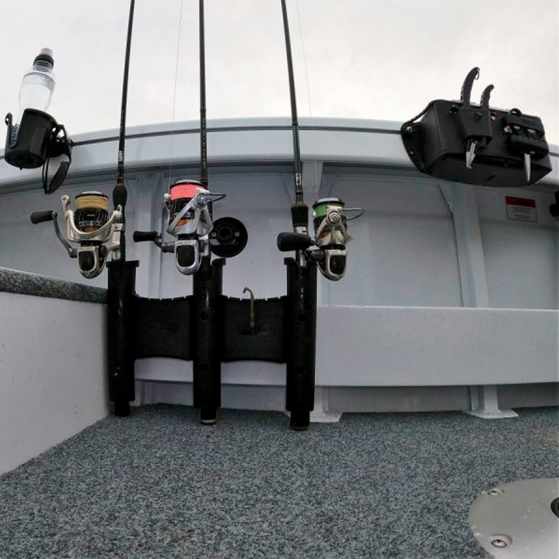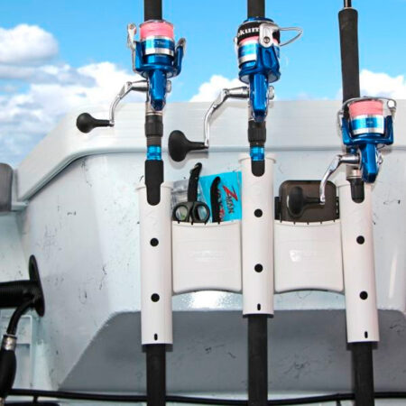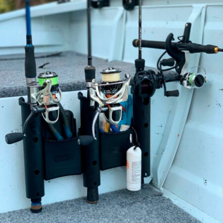 Il RodStow Triple è disponibile in nero o bianco, viene fornito con elementi di fissaggio in acciaio inossidabile e può essere installato in pochi minuti. È dotato di un contenitore per esche, tracce e altre attrezzature, è anche abbastanza grande da contenere una piccola cassetta degli attrezzi. Questi portacanna hanno un perno cardanico rimovibile che puoi lasciare per sostenere l’asta e fermare la rotazione, o rimuovere per far passare l’asta.