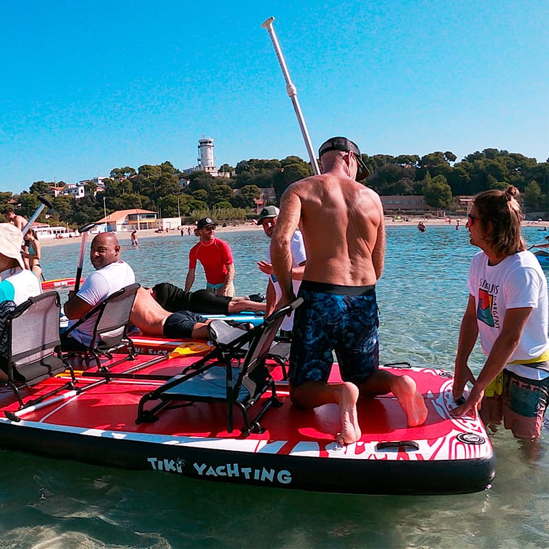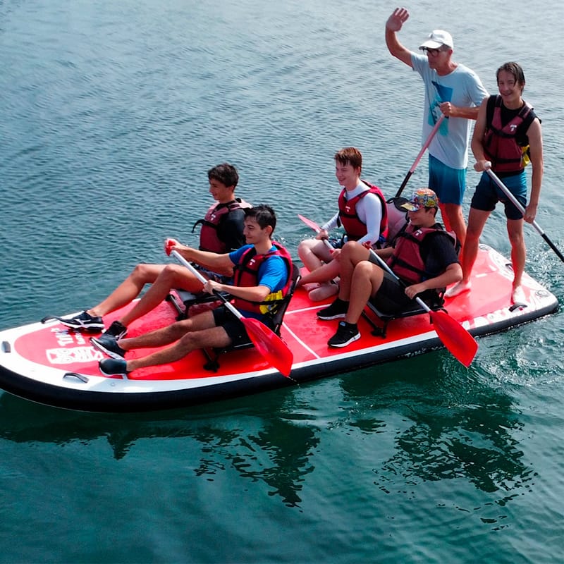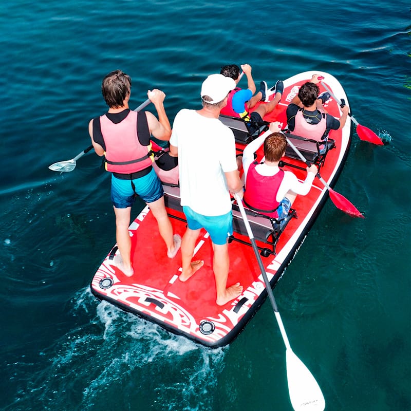 E’ dotato di 4 sedili reclinabili che consentono l’imbarco di 4 persone nel massimo comfort, la coperta è interamente rivestita in schiuma EVA. È possibile attaccare 2 pinne sul retro della tavola, pinne fornite.